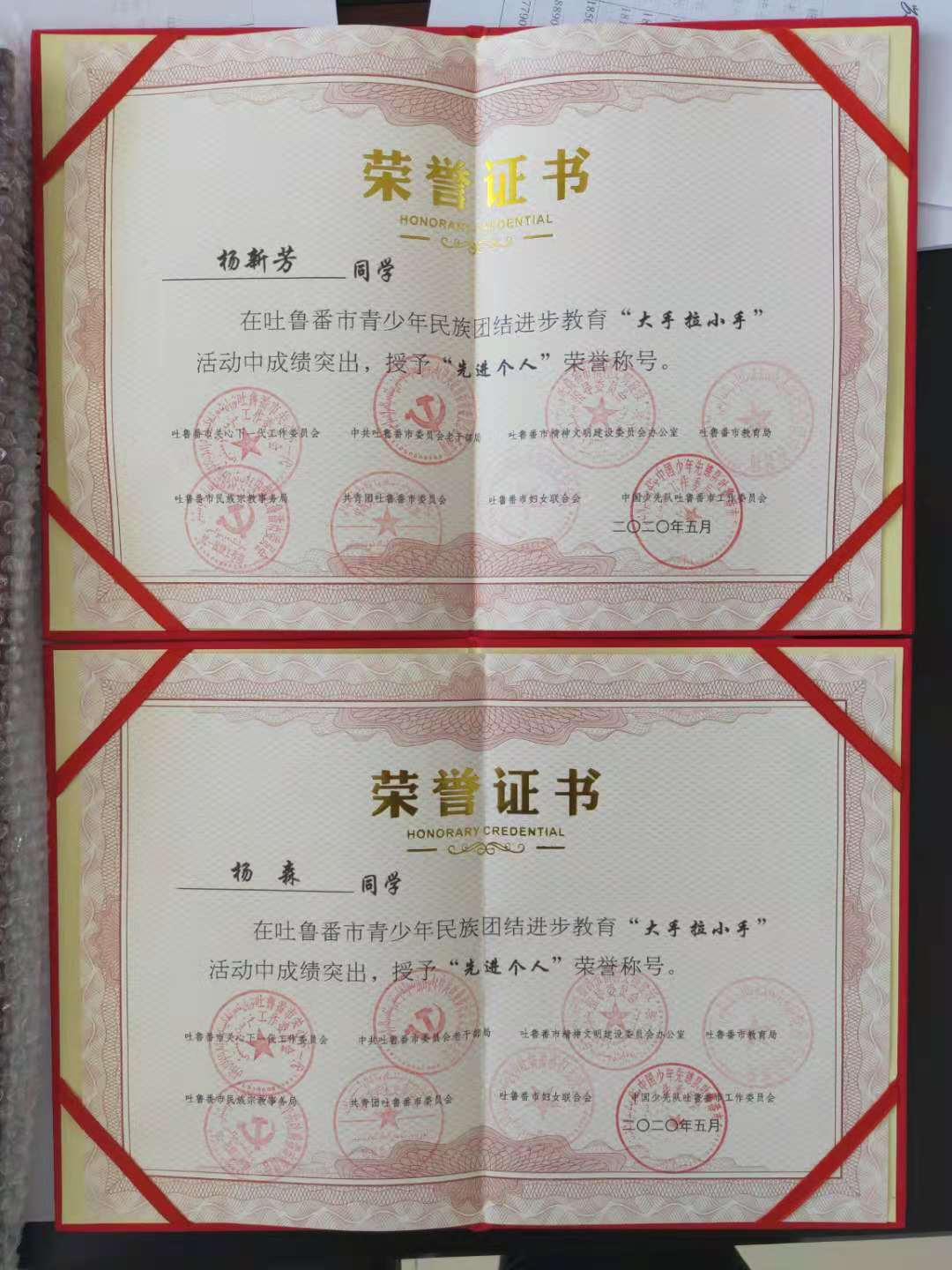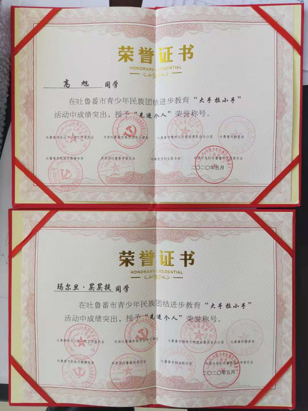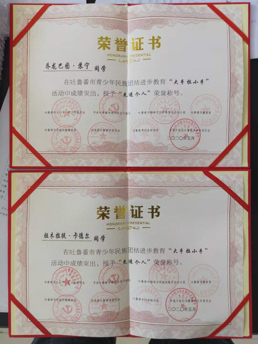 2020年5月,我院杨新芳、杨森、乔龙巴图·索宁、祖木拉提·卡德尔、高旭、玛尔旦·买买提等六名学生获得吐鲁番市青少年民族团结进步教育“大手拉小手”活动“先进个人”荣誉称号。